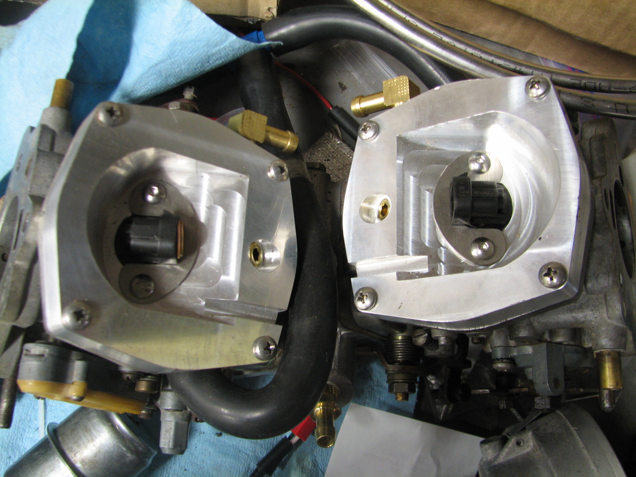 Here are the adapter plates (with injectors) attached to the carbs. In this picture they are on the workbench.