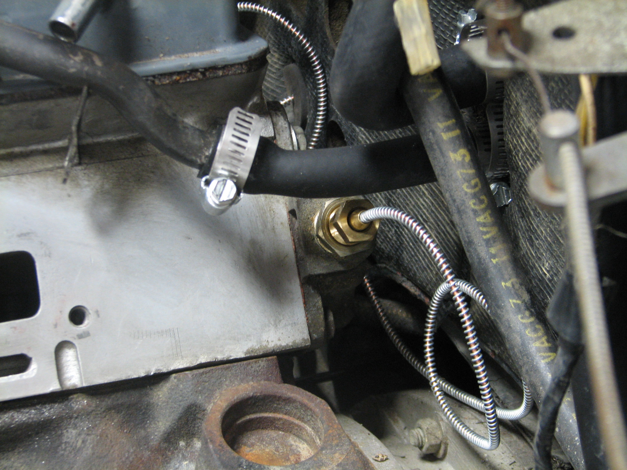 Once the water pump was sorted, we began installing the parts for the fuel injection conversion. The photo below is a shot of one of the sensors. This particular sensor measures coolant temperature.  Additional photos below illustrate the Fuel Pressure Regulator, the new fuel line to the engine, the new return line back to the tank, and the fuel pump mounted underneath the car.  Scroll down to take a look and read more details.