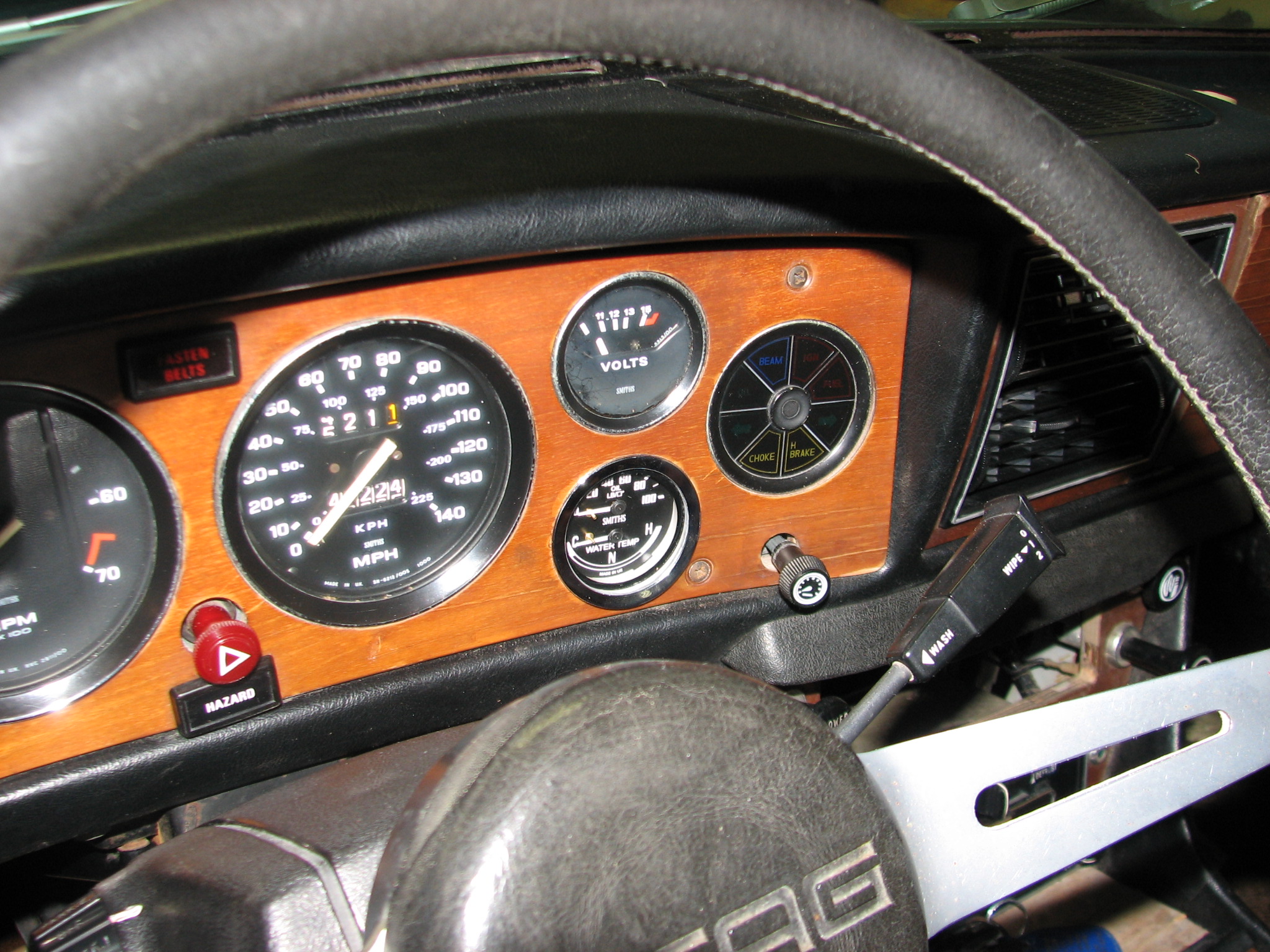Let’s take a look at the progress on the Stag. If you’re just tuning in, we’re installing a  Throttle Body Injection Kit from Patton Machine.  Dean has already dealt with a malfunctioning window switch and a rusted windshield wiper motor (see this post).  Next, the water pump was leaking, which necessitates removing the intake manifold.  (Click any picture to expand.)