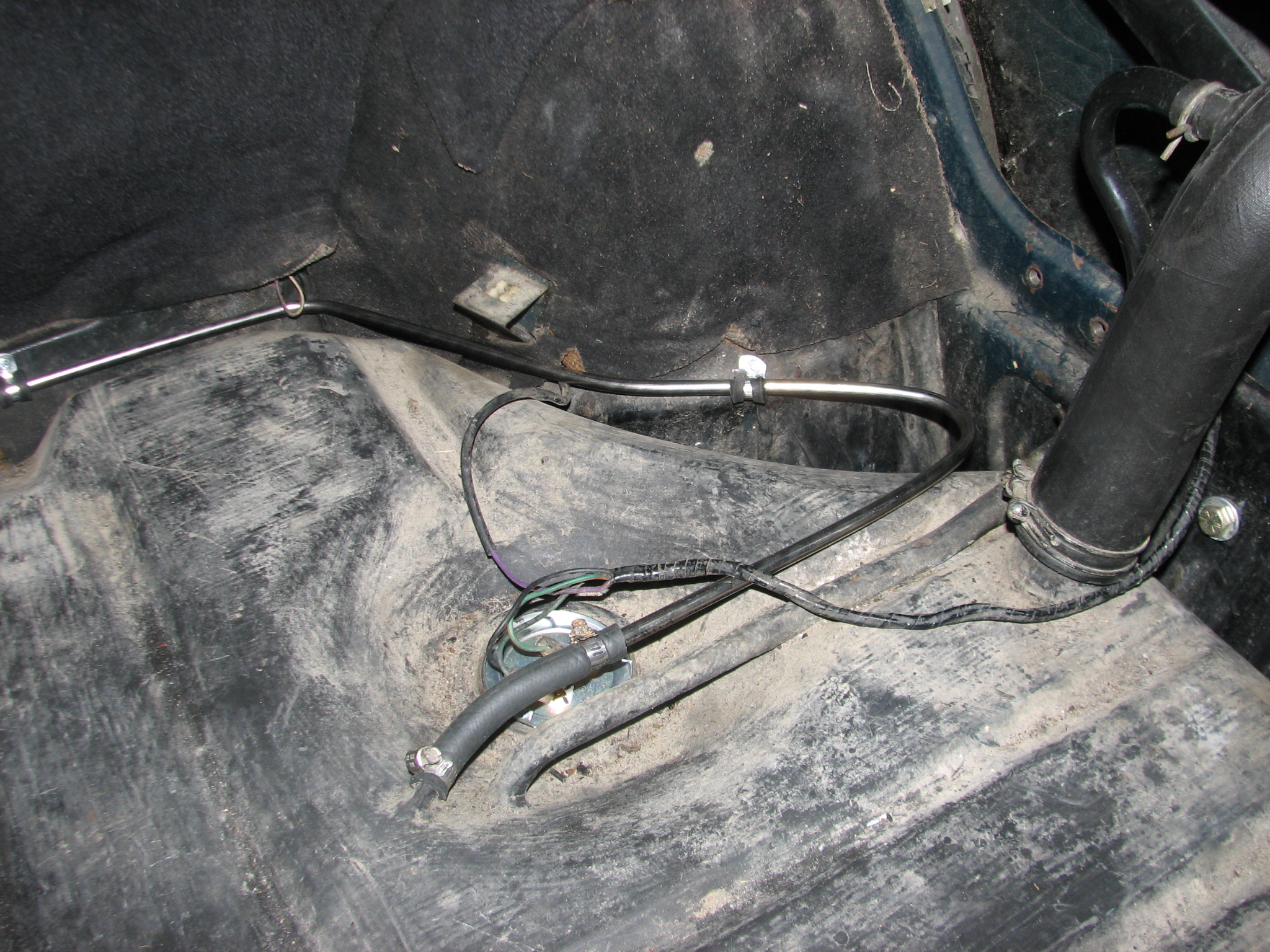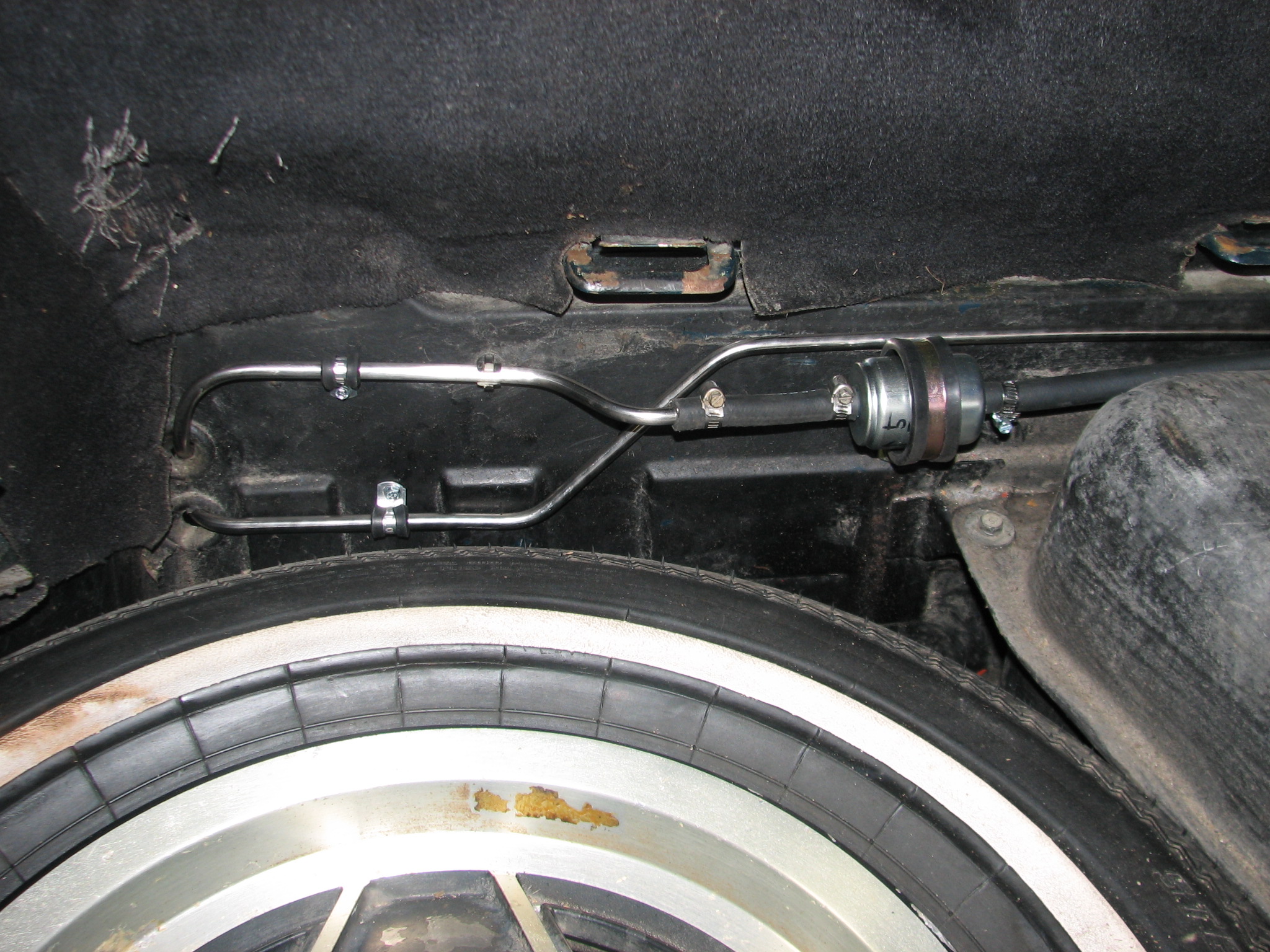 We’re in the trunk for this picture. Both of these lines are new and bent by Dean. The line with the filter on it is the outbound line and the other line is the return line back to the tank.