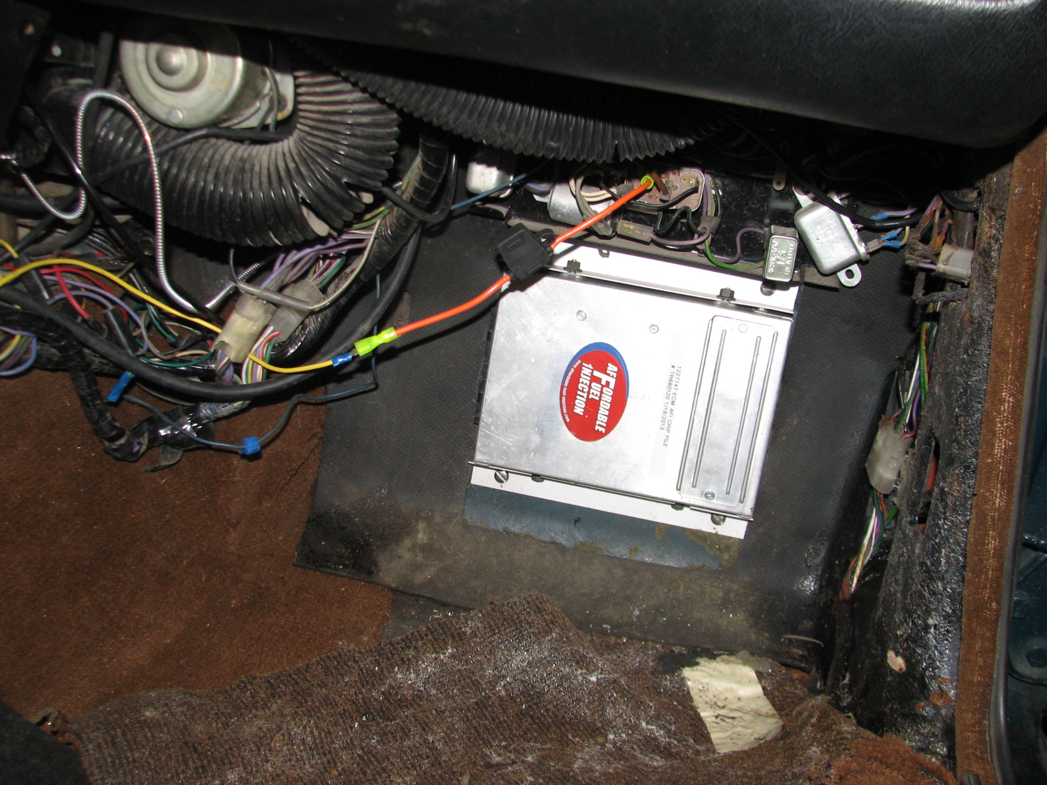 The computer is mounted to the firewall in the passenger’s side footwell.
