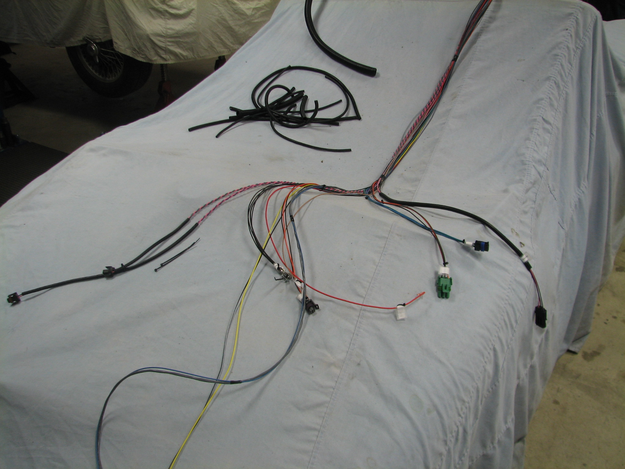 Here is the wiring harness that comes with the Fuel Injection Kit. We are going to modify the harness so that it fits better in the car.  It’s a bit lengthy as it comes and we think we can make the installation a bit more tidy.  Patton doesn’t do a Stag specific kit, so we’re adapting this one to work.